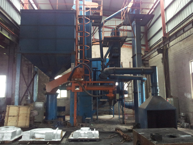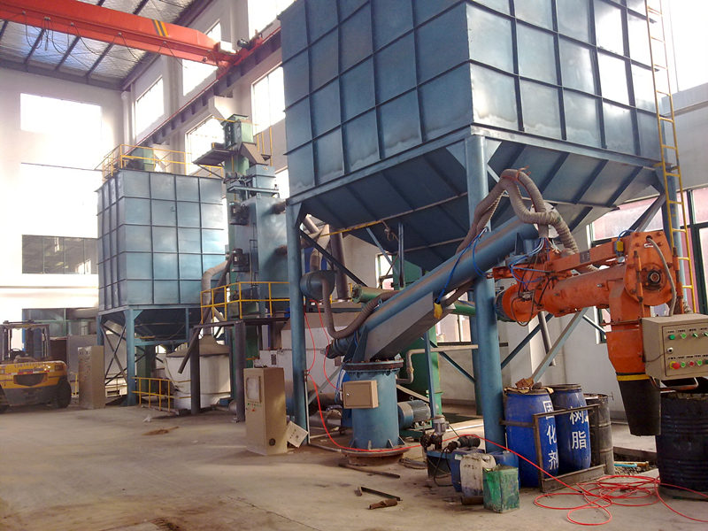 树脂砂设备生产线再生再利用设备采用一次破碎、二次再生、二次磁选、筛分、多次空分去除粉尘再生的工艺,使再生砂的颗粒形状良好,粒度浓度显著提高,并且颗粒形状更加合理,从而减少树脂的添加,降低成型成本。是因为不需要添加新砂,新砂直接添加到旧砂再生,与旧砂再生过程中混合,这样旧砂的水分和尘埃含量减少,和沙子颗粒圆形颗粒形状更加合理,从而减少树脂和固化剂的消耗。