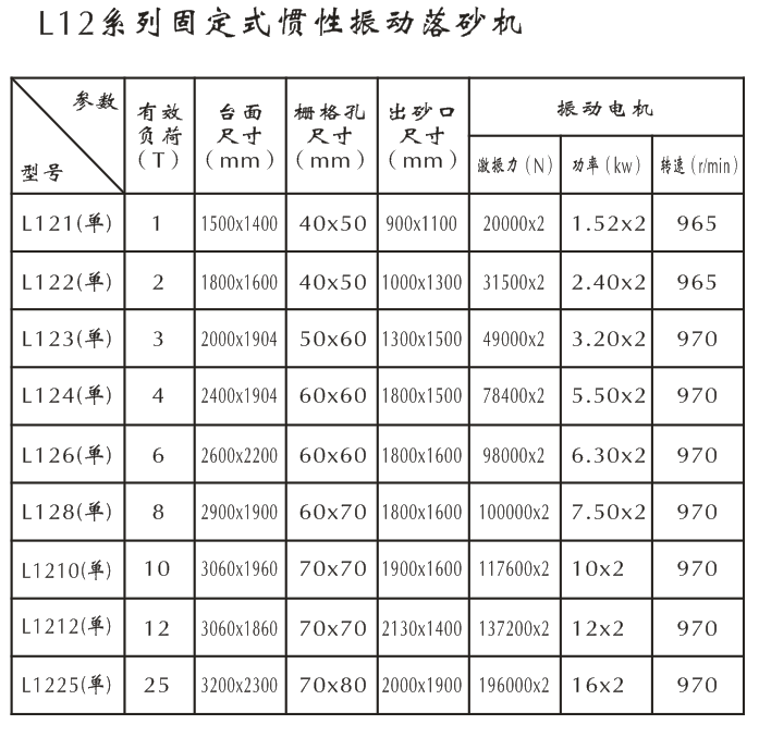 主要用于铸造车间的造型浇注后铸型的落砂。 可单台使用也可多台并联使用。采用焊接结构, 整体退火,性能可靠,安装方便,维修量小,落 砂效果好,停车平稳。