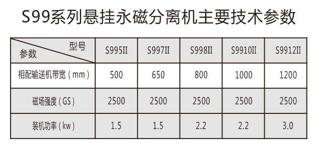 注:S95、S97、S99系列永磁分离设备,采用了高强磁性材料,具有磁性强、磁分离效果好、运转平稳、 性能可靠等优点